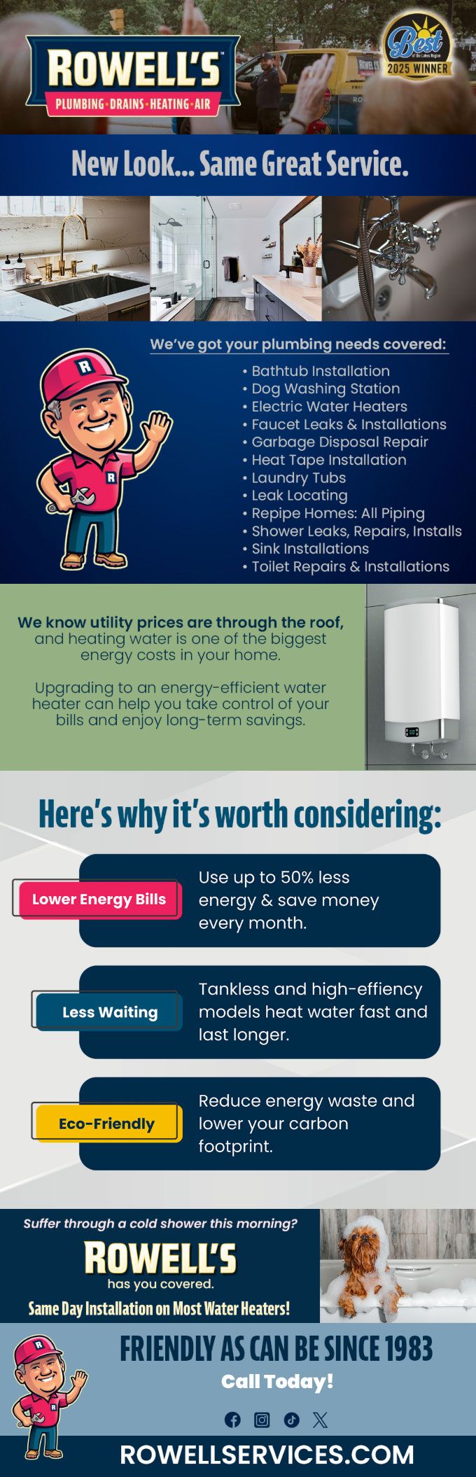 "Friendly As Can Be Since 1983!" When you need help with your plumbing, drains, heating, cooling or electrical in Bartlett, you can always rely on Rowell's Services! Call us now or book online!