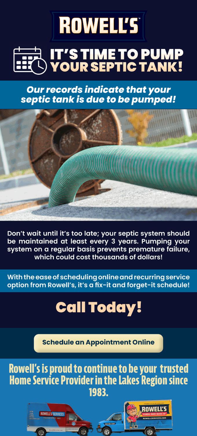 Don't wait until it's too late; your septic system should be maintained at least every 3 years. Pumping your system on a regular basis prevents premature failure, which could cost thousands of dollars!