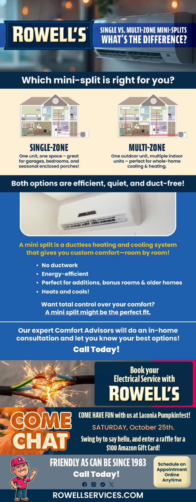 "Friendly As Can Be Since 1983!" When you need help with your plumbing, drains, heating, cooling or electrical in Bartlett, you can always rely on Rowell's Services! Call us now or book online!
